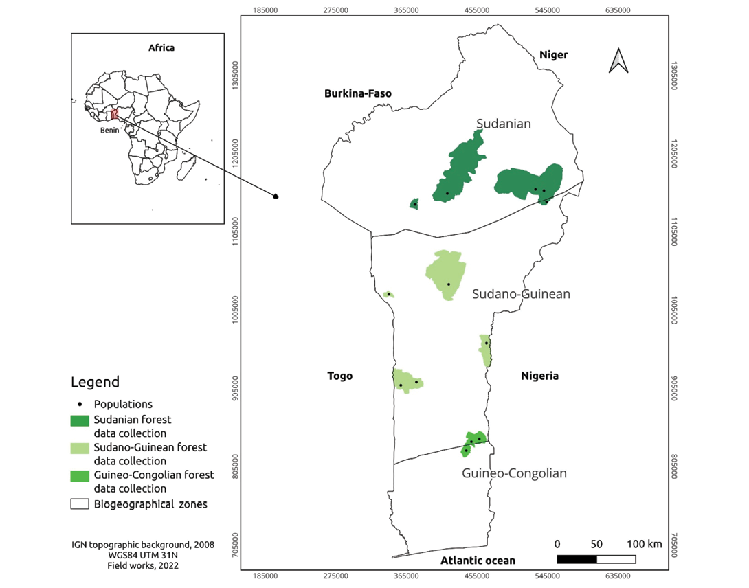 This study was conducted in Benin (6°30’ – 12°30’N, 1° – 3°40’E; ~ 112,622km²), located in West Africa, which is characterized by three distinct biogeographical zones: the Guineo-Congolian zone the Sudano-Guinean zone and the Sudanian zone (Akoègninou et al, 2006) (Figure 1). The Guineo-Congolian zone features a subequatorial climate with bimodal rainfall, experiencing a major rainy season from April to July and a high humidity range of 85% to 90% (Adomou et al, 2006). Temperatures in this zone range between 23°C and 32°C, with annual precipitation varying from 950mm to 1,400mm and are characterized by semi-deciduous forests on ferralitic soils. The Sudano-Guinean zone, located between 7° and 8°30’N, exhibits complex precipitation patterns influenced by both southern and northern climatic systems, with an average annual rainfall of 1,200mm, a temperature of 27°C, and 60% humidity. This zone is mainly characterized by wooded savannas and open forests (Adomou et al, 2006). The Sudanian zone, located between 8°30’ and 12°30’N, has a unimodal rainfall pattern, with annual precipitation ranging from 900mm to 1,100mm and an average temperature of 27.5°C (Adomou et al, 2006).