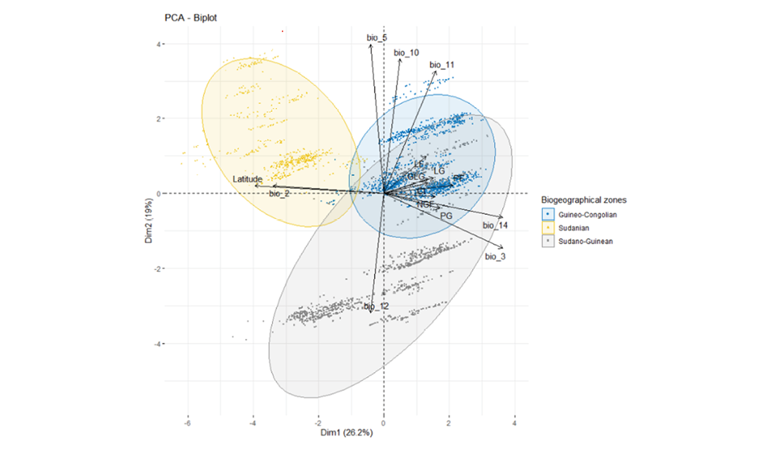 The study found no strong correlation between morphological traits and bioclimatic variables. This may be partly explained by the species’ distribution range, which does not fully extend across all latitudes of the Guineo-Congolian zone. Indeed, P. kotschyi is ecologically classified as a Sudanian species, and individuals sampled in the so-called Guineo-Congolian zone were located near the transitional boundary with the Sudano-Guinean zone. Therefore, the limited latitudinal range of occurrence in the southern zone may restrict the expression of morphological responses to broader climatic gradients. Similar observations have been made in other studies, where the ecological amplitude of species influences their trait-environment relationships (Assogbadjo et al, 2011). Moreover, integrating additional variables – such as genetic diversity and soil properties - could provide a more comprehensive understanding of the factors driving morphological variability (Freschet et al, 2017).