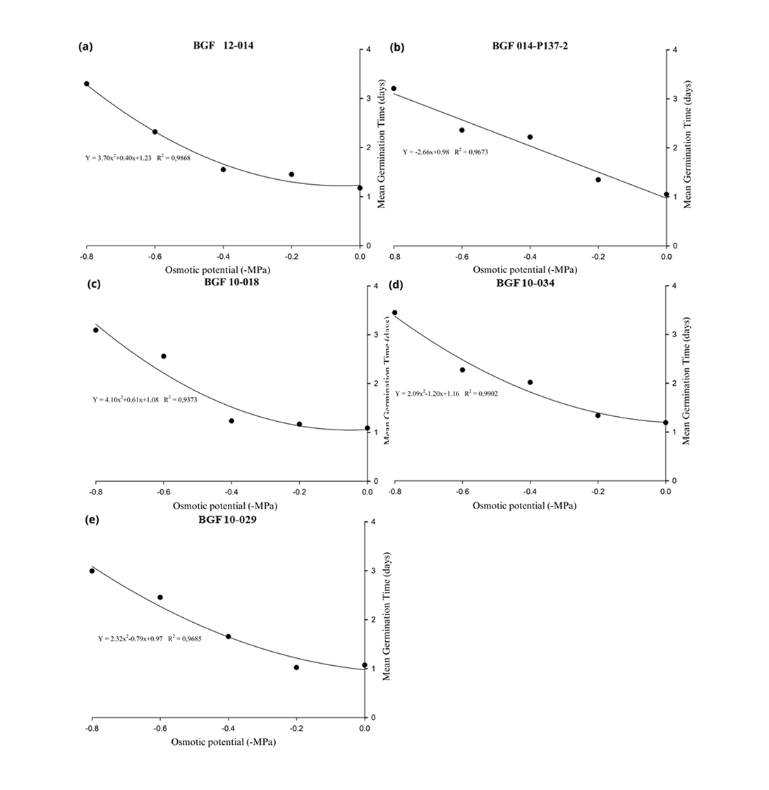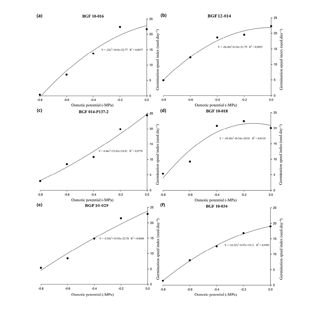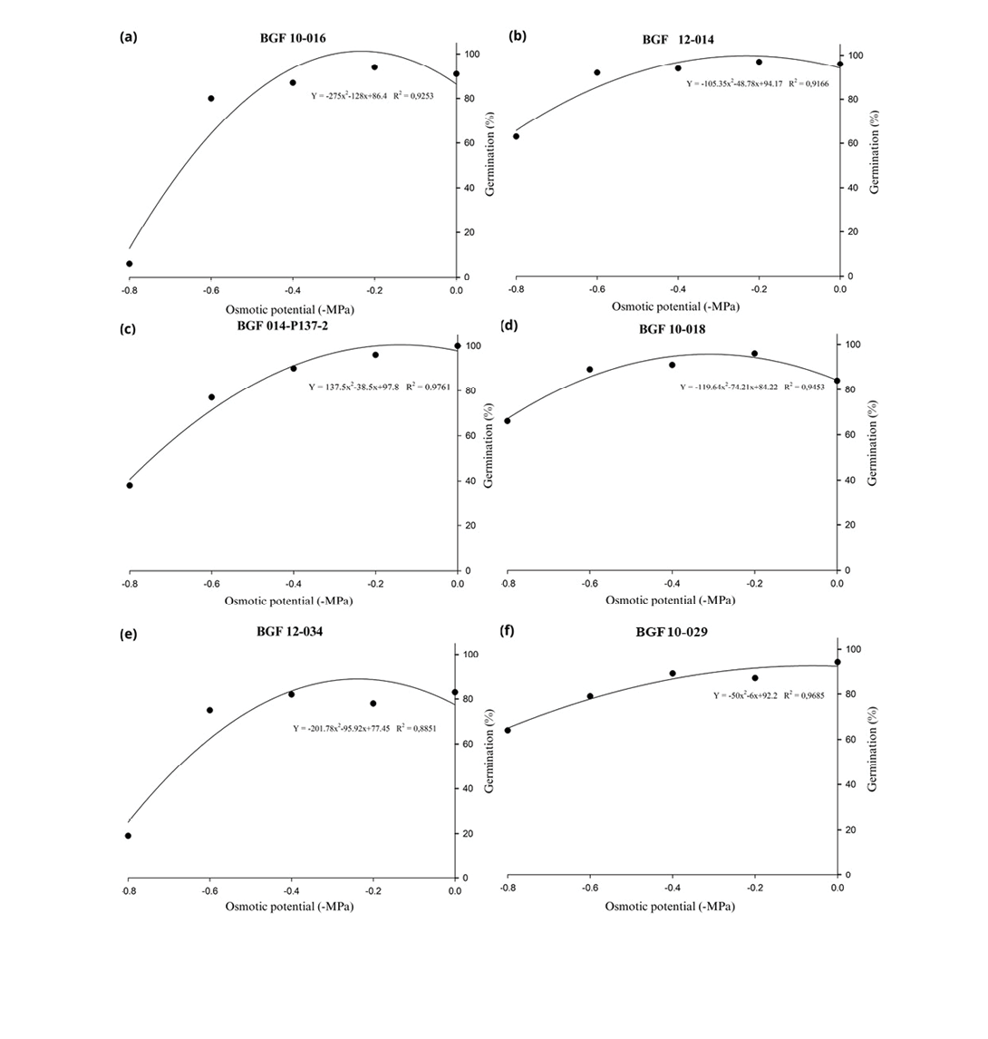 Accessions BGF 10-029 (Figure 1f), BGF 12-014 (Figure 1b), and BGF 10-018 (Figure 1d) exhibited less steep regression curves than the other materials, indicating lower sensitivity to water stress. Moreover, under the most negative osmotic potential, these accessions maintained relatively high mean germination percentages, ranging from 63% to 66%. In contrast, accession BGF 014-P137-2 (Figure 1c) showed intermediate performance under the same conditions, with a germination rate of 38%. Accessions BGF 10-034 (Figure 1e) and BGF 10-016 (Figure 1a) showed the poorest performance under the imposed water stress conditions, with germination percentages at the most negative osmotic potential reaching only 19% and 6%, respectively, reflecting substantial reductions compared to the control treatment (0.0MPa), and indicating that under low water availability, these genetic materials are notably disadvantaged in terms of germination occurrence.