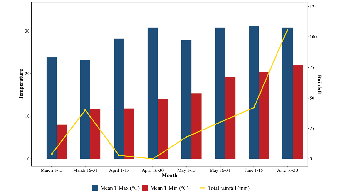 Ten cucumber accessions, collected from ten districts of Nepal (Table 1), along with one check variety, Bhaktapur Local, were characterized and evaluated at the research field of the National Agriculture Genetic Resources Center (NAGRC) in Khumaltar, Lalitpur, in 2024. The experimental site is located at an altitude of 1,368m a.s.l., with coordinates 27°40'N latitude and 85°20'E longitude. The check variety Bhaktapur Local is the best commercial variety registered in 2018 (MoALD, 2024). The experiment region receives 4.4 to 105.7mm of rainfall and experiences average temperatures of 15.2ºC (min) and 28.2ºC (max) (Genebank, 2023)(Figure 1). The soil type at the research site was black loamy (Ghimire and Magar, 2017).