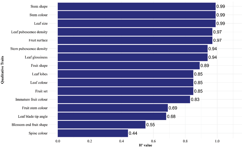 Genetic variation is a prerequisite for the improvement of any crop (Gaikwad et al, 2011; Chalbi et al, 2023). Diversity assessment assists plant breeders in recognizing and selecting the desirable traits, minimizing the challenges associated with parental selection, thereby facilitating the progression of generations (Chikh-Rouhou et al, 2023; Azam et al, 2024). A landrace is a dynamic population of cultivated crops with historical existence, unique identity, genetic diversity, and often lacking systematic crop enhancement (Villa et al, 2005). It is regionally adapted to tolerate both biological and environmental stresses, leading to stable yield, and is connected to traditional agriculture practices (Zeven, 1998). A diverse range of cucumber landraces, along with their wild relatives, exists in Nepal (Mainali and Jyakhwa, 2023), and it is critical to gather and conserve the existing landraces to prevent genetic erosion.