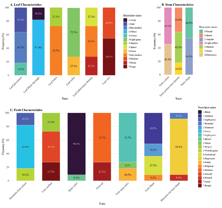 The Nepalese cucumber accessions exhibited substantial agromorphological variation, underscoring their potential for genetic improvement. Subsistence and commercial farmers in Nepal place greater emphasis on traits such as early flowering, higher fruit number and longer and wider fruits for market acceptance. Accordingly, breeders should prioritize accessions such as CO10293, CO14392 and CO13634 for their superior fruit dimensions and yield potential. Multivariate analysis highlighted key traits and superior parents for hybridization, with the observed phenotypic diversity providing valuable opportunities for yield improvement, selection and conservation. To fully exploit this variability, multi-location and multi-year evaluations, complemented by molecular characterization, are recommended.