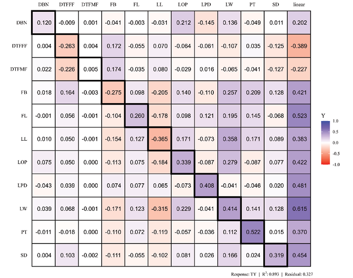 The qualitative and quantitative data were recorded and entered into Microsoft Excel (2016). The quantitative data (Supplemental Table 3) were analyzed for descriptive statistics by using the pastecs package (Grosjean and Ibanez, 2002) in R Studio (4.4.3) (R Core Team, 2025). The qualitative data were analyzed by using the package summary tools (Comtois, 2014). Shannon’s Weaver diversity index (H’) (Shannon, 1948) was calculated by using the formula in Microsoft Excel. For both quantitative and qualitative traits, the data were classified into nine intervals, and the resulting diversity indices were categorized into four classes: low (0.1–0.4), intermediate (0.4–0.6), high (0.6–0.8), and very high (>0.8), as described by Eticha et al (2006). PCA was prepared by using the package factoextra (Kassambara and Mundt, 2016), factominor (Husson et al, 2006) and gridextra (Auguie, 2010). The estimates of genetic parameters – genotypic variance (GV), phenotypic variance (PV), genotypic coefficient of variance (GCV), phenotypic coefficient of variance (PCV), heritability (H2bs), genetic advance as a percentage of mean (GAM) – were calculated by using the variability package (Popat et al, 2020), whereas phenotypic path analysis was done using metan package (Olivoto and Lúcio, 2020) in R Studio. The optimum number of clusters was determined by using the factoextra (Kassambara and Mundt, 2016) package. The hierarchical cluster dendrogram was created by using denextend (Galili and Jefferis, 2014) and the circilize (Zuguang Gu, 2024) package.