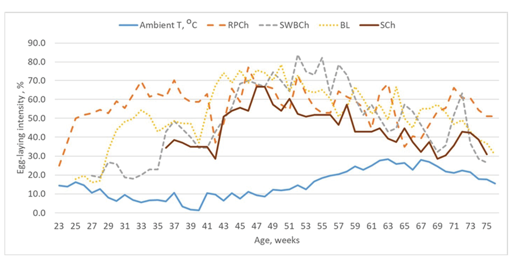 Figure 1 illustrates the changes in egg-laying intensity over the entire productive period for the tested groups of hens. Peak values of 77.1% laying intensity for RPCh group were recorded during the 24th productive week, with an average weekly ambient temperature of 10.4°C.
