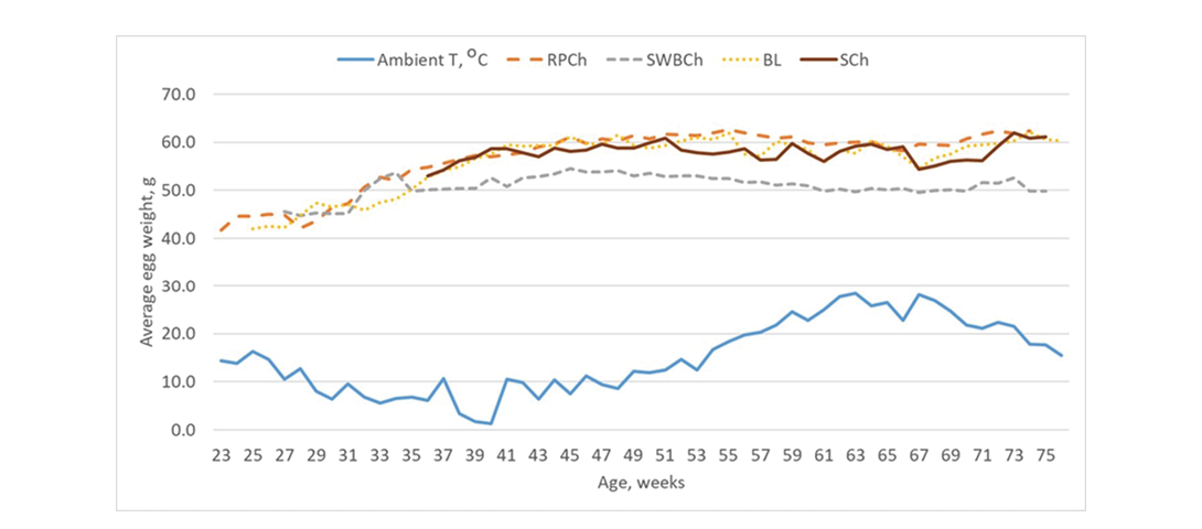 Modern commercial laying hens produce eggs with an average weight of 62–65g over the entire laying period (Genchev and Lukanov, 2025). Globally, however, average egg weight tends to be slightly lower, around 60–61g, with regional preferences influencing egg size (Thiruvenkadan et al, 2010). The detrimental impact of elevated ambient temperatures on egg weight in domestic hens has been thoroughly documented by Bennion and Warren (1933). Similar to egg production, egg weight is adversely affected by heat stress and reduced feed intake of the birds (Kilic and Simsek, 2013).