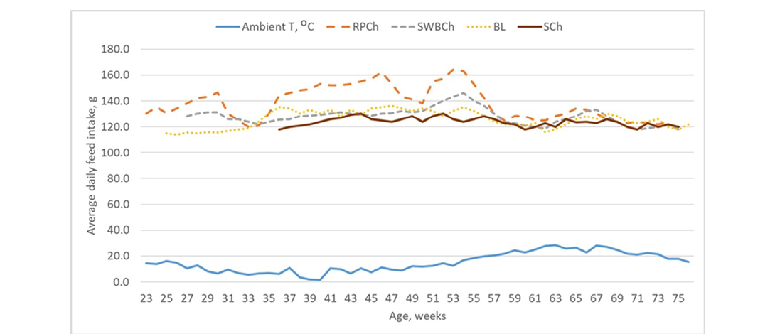 Patterns of average daily feed intake were generally similar among the four experimental groups, although RPCh exhibited more pronounced fluctuations up to approximately mid-lay (Figure 3). The highest intakes were recorded during the first half of the productive cycle, with RPCh consistently showing the greatest values (peaking above 160 g/day), followed by SWBCh, BL and SCh. As average daily ambient temperatures increased in late spring and summer, feed intake gradually declined across all groups, remaining at lower levels until the onset of molting or the end of the experimental period. The SCh group maintained the most stable intake pattern throughout the cycle, with only minor variations relative to seasonal changes in temperature.