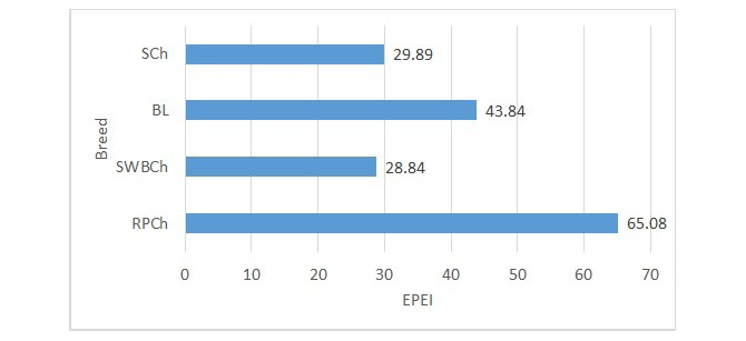 The calculated EPEI for each of the four breeds included in the study is presented in Figure 4. This index reflects the efficiency of producing both table and hatching eggs. Lower EPEI values indicate less efficient production. Notably, the RPCh group recorded the highest efficiency (EPEI = 65.08), clearly distinguishing itself from the other breeds. The second-highest value was observed in the BL group, although it was 32.6% lower than that of RPCh. The least efficient performance was observed in the SWBCh and SCh groups, with EPEI values of 28.84 and 29.89, respectively. Liveability is one of the main parameters influencing the EPEI. Over the entire production period, the overall liveability of hens from the four groups was identical at 80%, with five birds per group lost due to mortality or culling, predominantly during the final stage of the laying period.