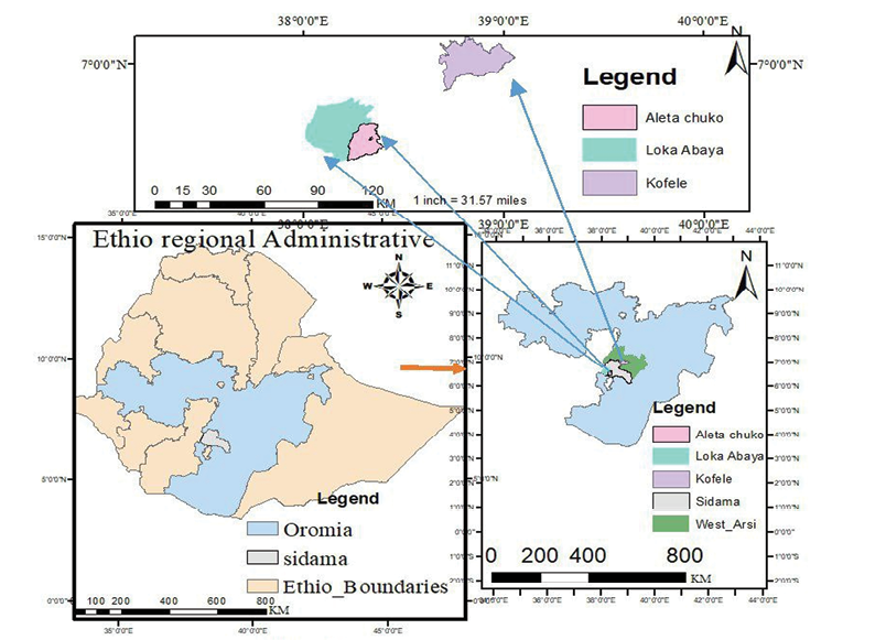 This study was conducted in three agroecological zones of southeastern Ethiopia, namely lowland, midland and highland. These agroecological zones were identified in two major regions, the Sidama and Oromia regions. The midland and lowland agroecological zones were sampled from the Sidama region, while the highland zone was considered from the West Arsi zone of the Oromia region (Figure 1). The description of agroecological zones is summarized in Table 1.