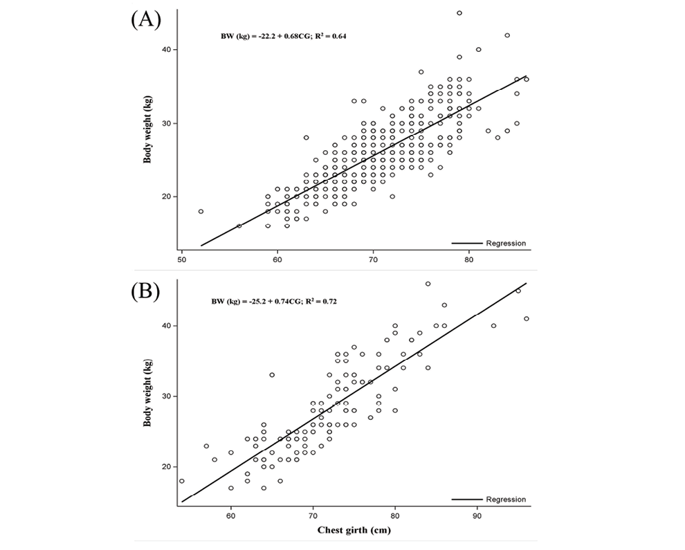 In the current study, the CG was identified as a suitable variable to predict the BW of goats, in line with the reports of Hankamo et al (2020), Tade et al (2021), Takele et al (2021), and Tyasi and Tada (2023). Dea et al (2019) reported the estimation of BW from the combinations of HW, BL and CG. However, the inclusion of many traits to estimate the live BW of farm animals is impractical since measuring more than one linear morphometric trait under farm conditions is time-consuming and increases measurement error. Therefore, the current study concurs with previous findings, confirming that estimating BW from a single linear morphometric trait, such as CG, will be a viable option when there is no measuring scale available in the farmer’s conditions. Moreover, CG is a good predictor of BW due to its contribution to muscle and bone development (Okpeku et al, 2011). In addition, from a field point of view, CG is less affected by the posture and restraints of animals and is easy to measure with minimum error compared to other morphometric traits.