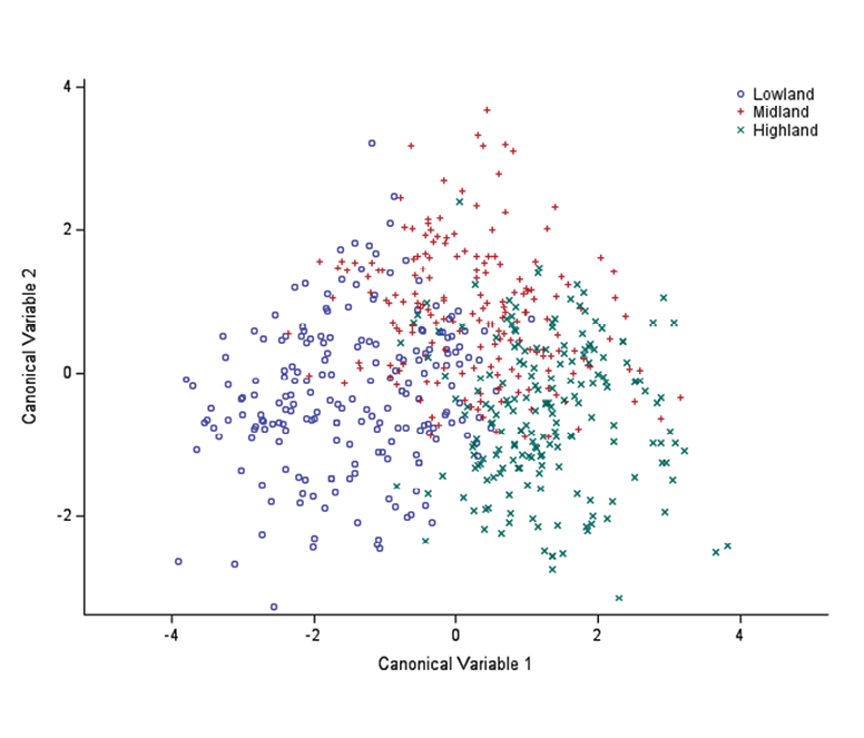Canonical discriminant analysis is a statistical tool which has been increasingly used to reduce the dimensionality of data (Macena et al, 2024) and identifies the linear combination of multiple traits that provide maximum correlation between groups (Takele et al, 2021; Melesse et al, 2022). The goal of such analysis is to reduce within-population variation and maximize between-group variations, which allows understanding of genetic similarity and diversity of the studied animal populations. The values of the two CANs in the present study were comparable with the findings of Tade et al (2021) who reported that CAN1 and CAN2 explained 70% and 30% of total variation in south Gondar goats, respectively, in accordance with the current findings. The significant difference between the two canonical variables in this study aligns with previous reports on various indigenous goat populations (Takele et al, 2021; Melesse et al, 2022; Guyo et al, 2023). In contrast, Selolo et al (2015) found that only the first canonical variable was significant. CD and SW showed the highest loading values, making them key traits for differentiating goat populations. These observations are consistent with those reported by Al-Atiyat et al (2024). The value of canonical correlation (0.74) for CAN1 indicates the strength of the function to discriminate the goats reared in the three agroecological zones. This indicates that the variables associated with CAN1, such as CD and SW, are most important variables to effectively discriminate the studied goat populations. In line with this finding, this strong correlation of CAN1 was reported by Ofori et al (2021), Ali et al (2024), Takele et al (2021) and Guyo et al (2023).