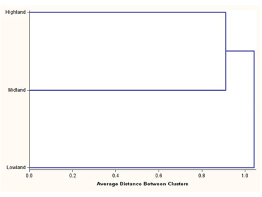 The Mahalanobis distance expresses the magnitude of variations at the phenotypic level among animal breeds/populations or groups (Dauda et al, 2018; Maksimović et al, 2023). The observed significant Mahalanobis distance indicates that the goat populations reared in three agroecological zones are morphologically different. The largest distance between the highland and lowland goat populations might be associated with geographical isolations between these two goat populations and management differences practiced by the farming communities of different agroecological zones (Ofori et al, 2021). The shortest distance between the highland and midland goats may indicate that these goats are closely related in the expression of their morphometric traits, which might have resulted in admixture and gene flow in both directions. The observed Mahalanobis distance values in this study closely agree with those reported for Boer and red Sokoto goats (Muhammad et al, 2021), while they were higher than those reported for Hararghe highland goats (Takele et al, 2021). On the other hand, higher values than those observed in the current study were reported for different indigenous goat breeds reared in Indonesia (Depison et al, 2020), Serbia (Maksimović et al, 2023) and Ghana (Ofori et al, 2021). The cluster analysis showed that the highland and midland goat populations were closely clustered, which might be due to their geographical proximity, leading to potential gene flow between these two goat populations. The Wilk’s lambda is the proportion of total variability not explained by the discriminator variables between populations (Takele et al, 2021). The value of Wilk’s lambda in the current study is 31%, which indicates that 69% of the variability in the discriminating traits was due to variation between populations rather than within populations. These results are comparable with those reported by Guyo et al (2023) for Arsi-Bale goats.