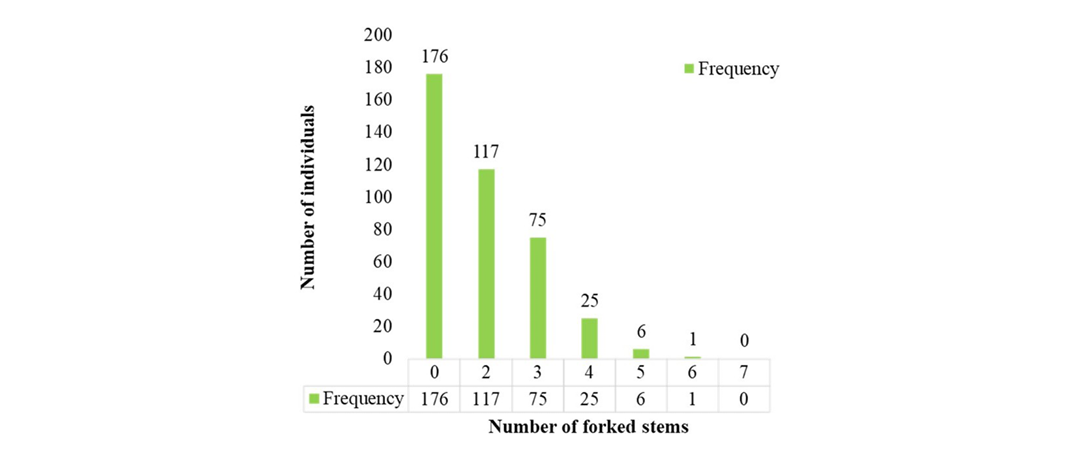Out of the 500 established germplasm lines, 400 survived and were assessed using ten morphological traits. The evaluation of the 12-year-old germplasm revealed an average tree height of 9.04m, with the tallest tree (11.8m) observed in accession S2R4-10 and the shortest (5.5m) in S4R1-7. The average clear bole height was 1.05m, with the highest (6.2m) recorded in S1R2-13. The number of forked stems ranged from 0 to 6, with 176 accessions exhibiting no forking. The accession S8R4-4 recorded the maximum of six forked stems.