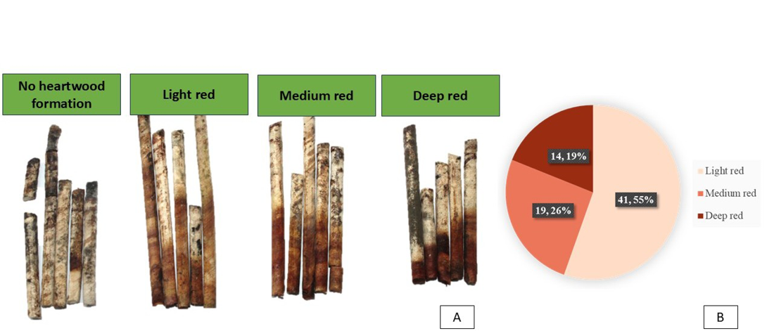 Figure 3 shows the frequency distribution of forked stems among red sanders accessions, illustrating the variation in forking observed across the population. The average GBH was 45.00cm, with the highest (78.00cm) observed in S2R1-23 and the lowest (26.00cm) in S3R2-2. Increment core samples had an average length of 7.58cm, with a maximum of 12.5cm in S2R1-23 and a minimum of 4.00cm in S3R2-2. The average sapwood core length was 7.1cm, with the highest value (7.9cm) recorded in S5R2-2. Heartwood formation was observed in 74 accessions (18.50%), with an average heartwood core length of 2.53cm. The maximum heartwood core length (6.6cm) was recorded in S5R1-19, followed by S7R4-4 (5.5cm), S6R4-3 (5.2cm), S5R4-20 (5.0cm), S3R4-23 (5.0cm) and S5R4-25 (4.5cm). The lowest heartwood core length (0.5cm) was observed in S4R1-19 and S3R1-17 (Supplemental Table 1). Analysis of heartwood colour of 74 accessions revealed light red colour in 41 accessions (55.41%), a medium red colour in 19 accessions (25.68%), and a deep red colour in 14 accessions (18.92%) (Figure 4A and B). A detailed list of the 74 heartwood-forming accessions, along with their heartwood colour and heartwood core length, is provided in Table 2.