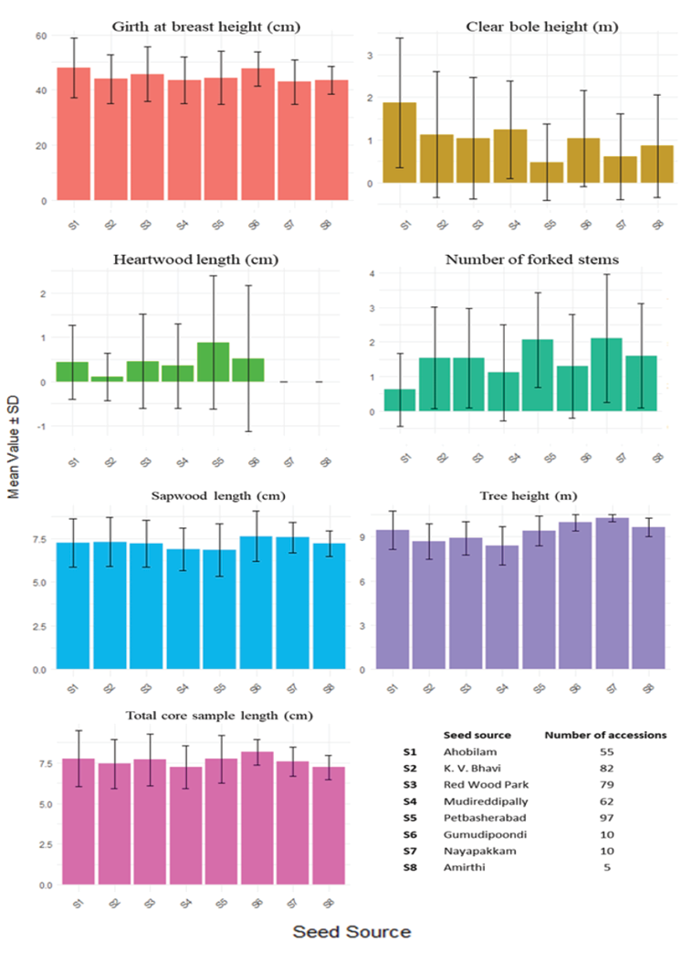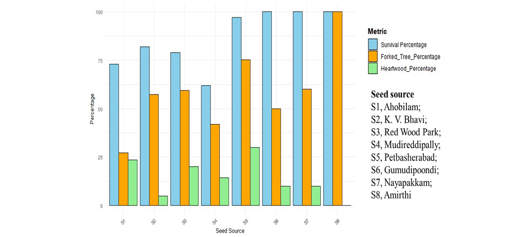 The significant differences in survival rates and growth traits among seed sources underscore the influence of genetic and environmental factors. Superior survival rates in seed sources such as Gumudipoondi, Nayapakam and Amirthi (100% survival) indicate their adaptability to environmental conditions. Conversely, the lower survival rates observed in Madireddipally (62%) warrant further investigation. The superior performance of accessions from Amirthi (tree height of 10.24m) and Petbasheerabad (high heartwood formation and survival rates) highlights their potential as elite seed sources for plantation programmes.
