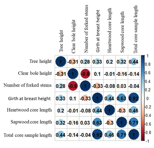 Figure 7. Correlation plot for various traits in red sanders. The circles represent the magnitude and direction of the Pearson correlation coefficients between trait pairs. The color scale shows correlation values, where blue indicates positive correlations and red indicates negative correlations. The intensity of the color and the size of the circles correspond to the strength of the correlation.