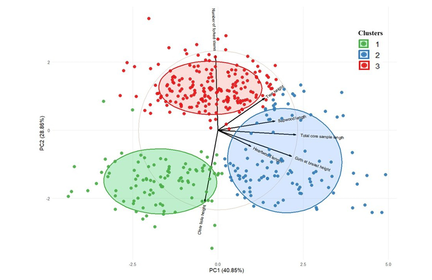 The PCA results indicate that PC1 primarily represents growth-related traits, whereas PC2 reflects structural variations such as stem architecture and clear bole height. The clustering further highlights natural groupings among the trees, which could be linked to genetic and environmental factors influencing tree morphology. Cluster 3 trees, with excessive branching and forked stems, might be less desirable for commercial timber purposes but could be valuable for conservation and biodiversity. In contrast, Cluster 1 trees, which have minimal branching and a high clear bole, might be more suitable for timber production, as fewer knots improve wood quality. Cluster 2 represents an intermediate growth pattern, possibly offering a balance between commercial and ecological benefits. This analysis highlights the multifaceted nature of trait variation and provides a robust framework for prioritizing traits in breeding programmes.